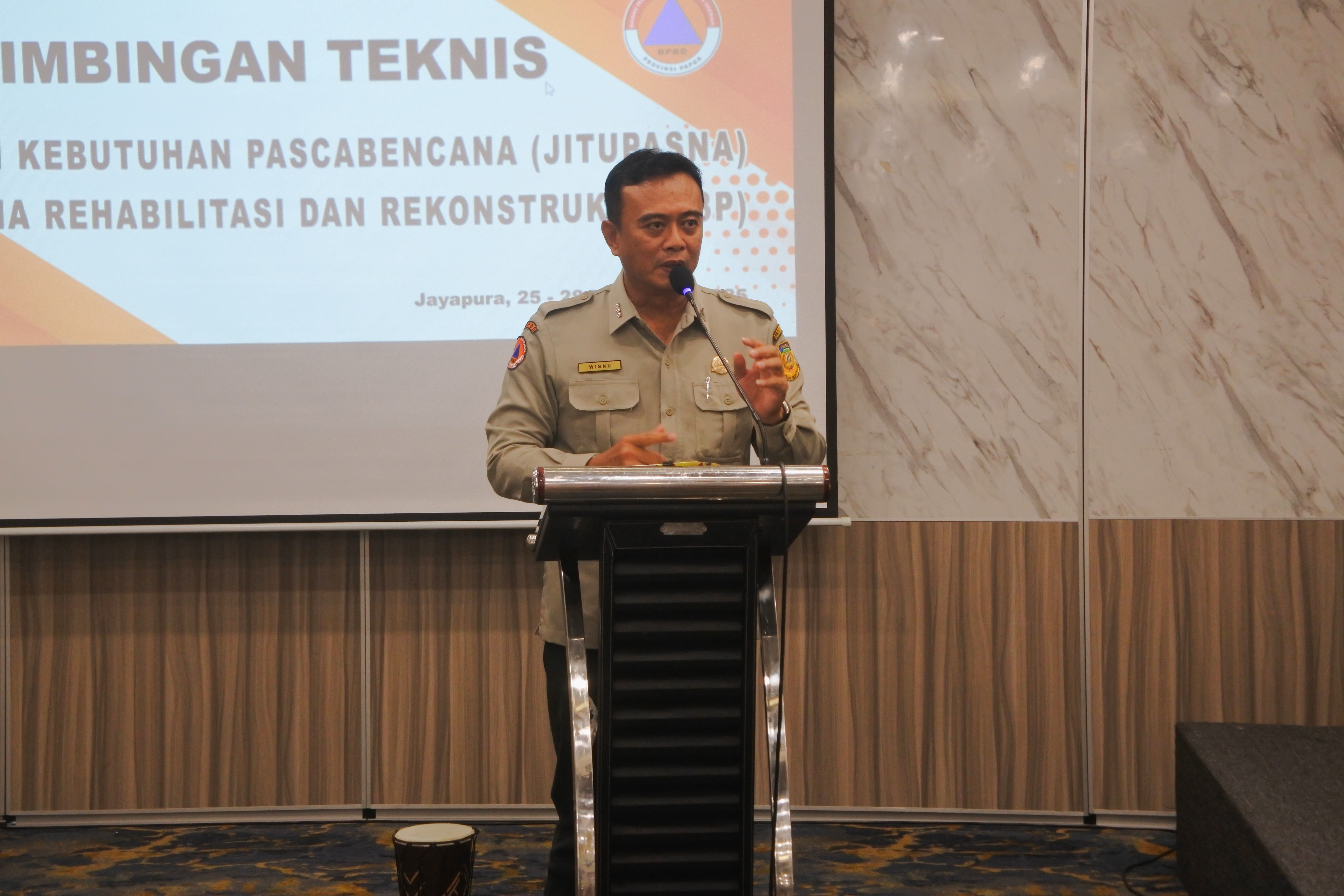 Jayapura, 25 November 2025 — Badan Penanggulangan Bencana Daerah (BPBD) Provinsi Papua menyelenggarakan Bimbingan Teknis Pengkajian Kebutuhan Pascabencana (Jitupasna) dan Penyusunan Rencana Rehabilitasi dan Rekonstruksi Pascabencana (R3P) yang berlangsung di Hotel Grand Abe, Jayapura. Kegiatan ini secara resmi dibuka oleh Plt. Kepala Pelaksana BPBD Provinsi Papua, Bapak Barkah Wisnu.