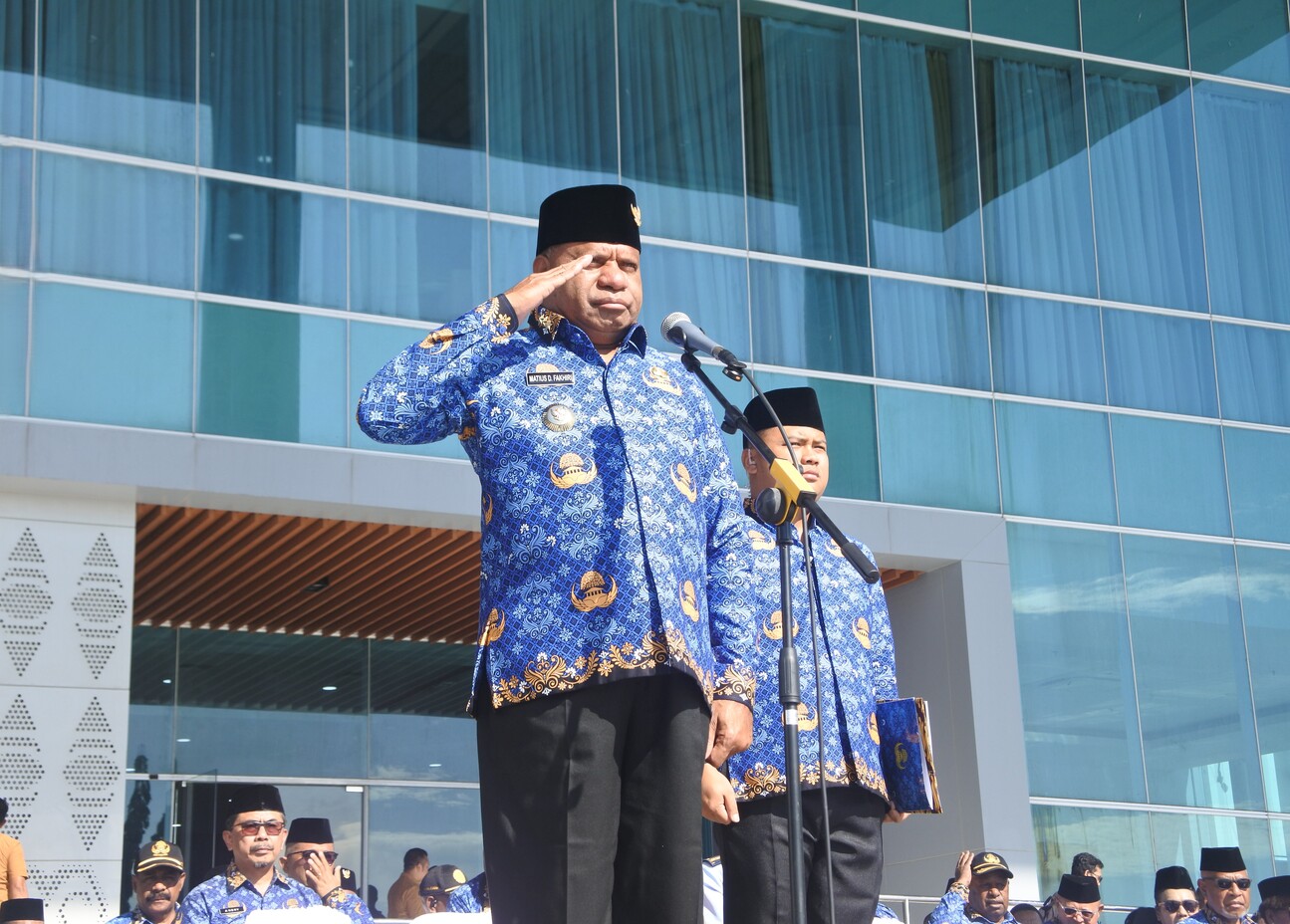 Jayapura – Penjabat (Pj) Gubernur Papua, A. Fatoni bersama Pj Sekda Papua, para asisten, dan pimpinan SKPD di lingkungan Pemerintah Provinsi Papua menggelar Apel Kebangsaan dan Doa Bersama Lintas Agama. Kegiatan ini berlangsung di Aula Lukmen, Gedung Negara Dok V Jayapura, Sabtu (6/9/2025).