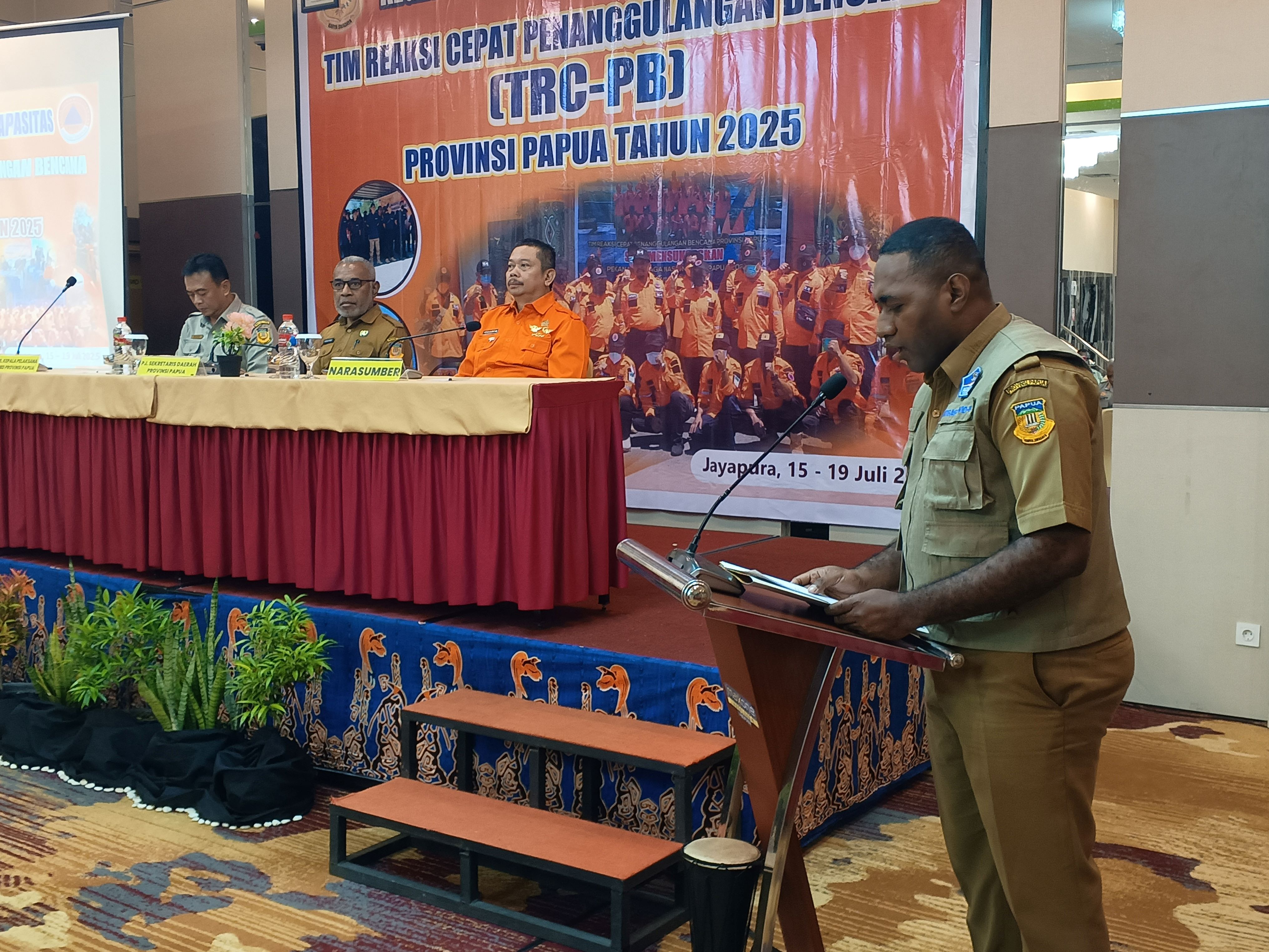 Jayapura, 15 Juli 2025 — Badan Penanggulangan Bencana Daerah (BPBD) Provinsi Papua secara resmi membuka kegiatan Pengembangan Kapasitas Tim Reaksi Cepat Penanggulangan Bencana (TRC-PB) Provinsi Papua Tahun 2025. Kegiatan ini dilaksanakan di Kariwari Ballroom Lt. 2, Maxone Hotel Jayapura, dan dihadiri oleh beberapa perwakilan dari stakeholder terkait Kab/Kota se-Provinsi Papua.